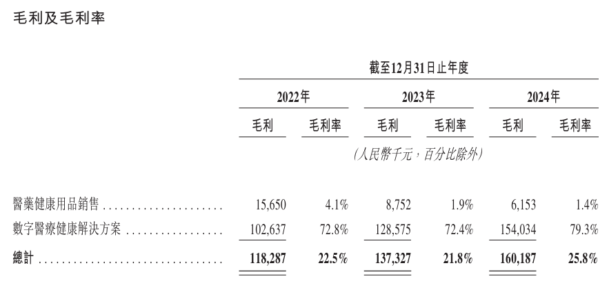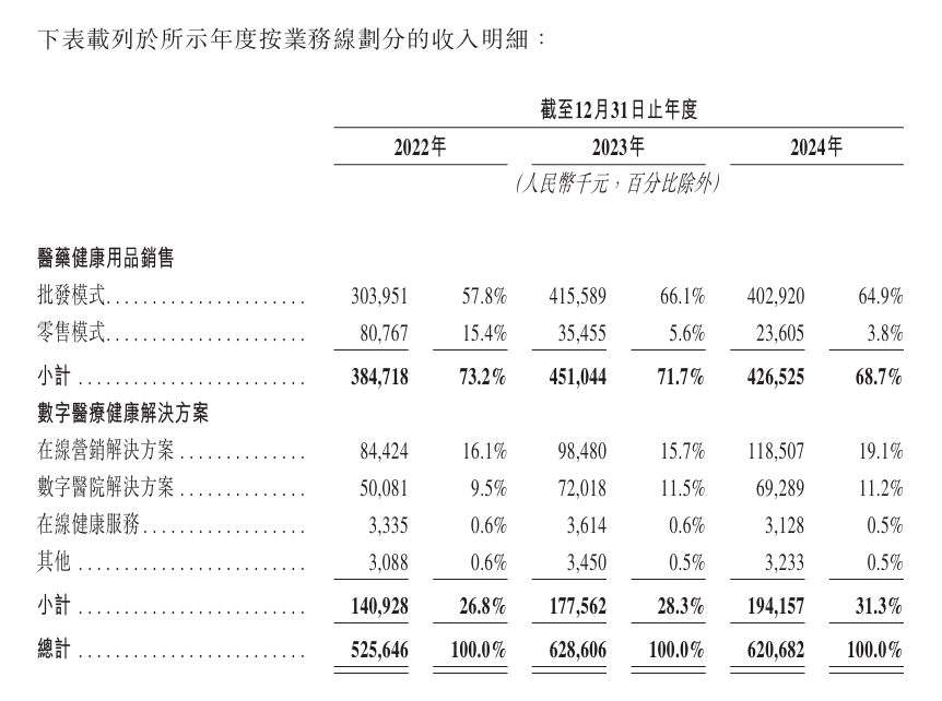 招股書顯示,在2022年、2023年及2024年,該公司醫(yī)藥健康用品銷售所產(chǎn)生的收入分別為3.85億元、4.51億元和4.27億元,分別占公司總收入的73.2%、71.7%及68.7%。