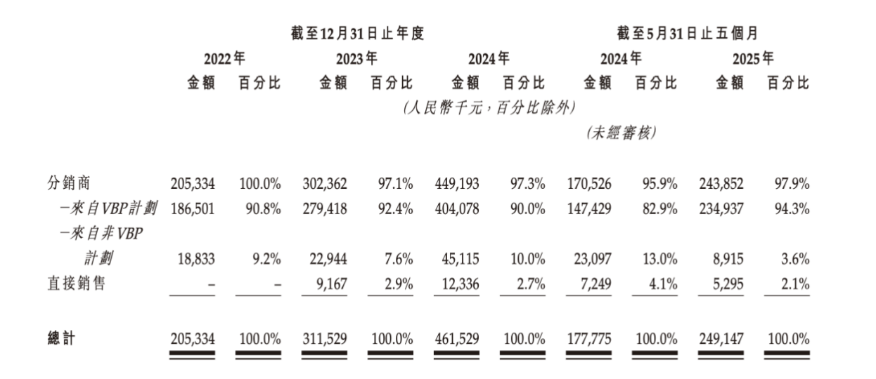 分銷是海西新藥最主要的銷售渠道。2024年,分銷商銷售金額為4.49億元,占海西新藥銷售總額的比重為97.3%。其中,來自VBP計劃的銷售金額為4.04億元,占海西新藥銷售總額的比重為90%。