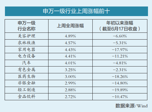 Wind數(shù)據(jù)顯示,上周在31個申萬一級行業(yè)板塊中,美容護(hù)理板塊以4.89%的漲幅位居第一,農(nóng)林牧漁、家用電器兩大板塊分別以4.57%、4.43%的漲幅緊隨其后——這三大板塊均與消費(fèi)有關(guān)。此外,汽車、食品飲料等消費(fèi)類板塊上周表現(xiàn)也較突出。