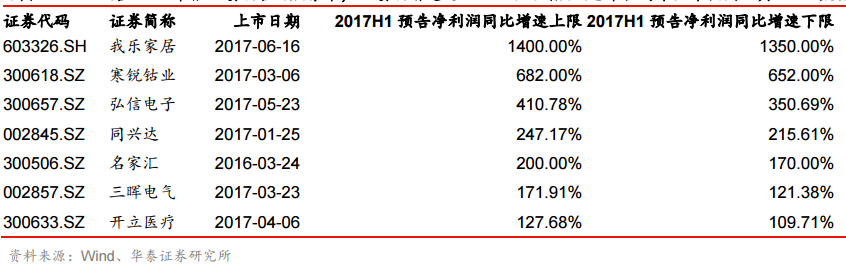 華泰證券認(rèn)為,2017年中報披露將近,建議關(guān)注已披露業(yè)績預(yù)告的次新股中,凈利潤增長超過100%的優(yōu)質(zhì)個股。業(yè)績?yōu)橥醯氖袌鰧徝老拢@些次新股更具安全性與吸引力。建議關(guān)注我樂家居、寒銳鈷業(yè)、弘信電子、同興達、名家匯、三暉電氣、開立醫(yī)療。