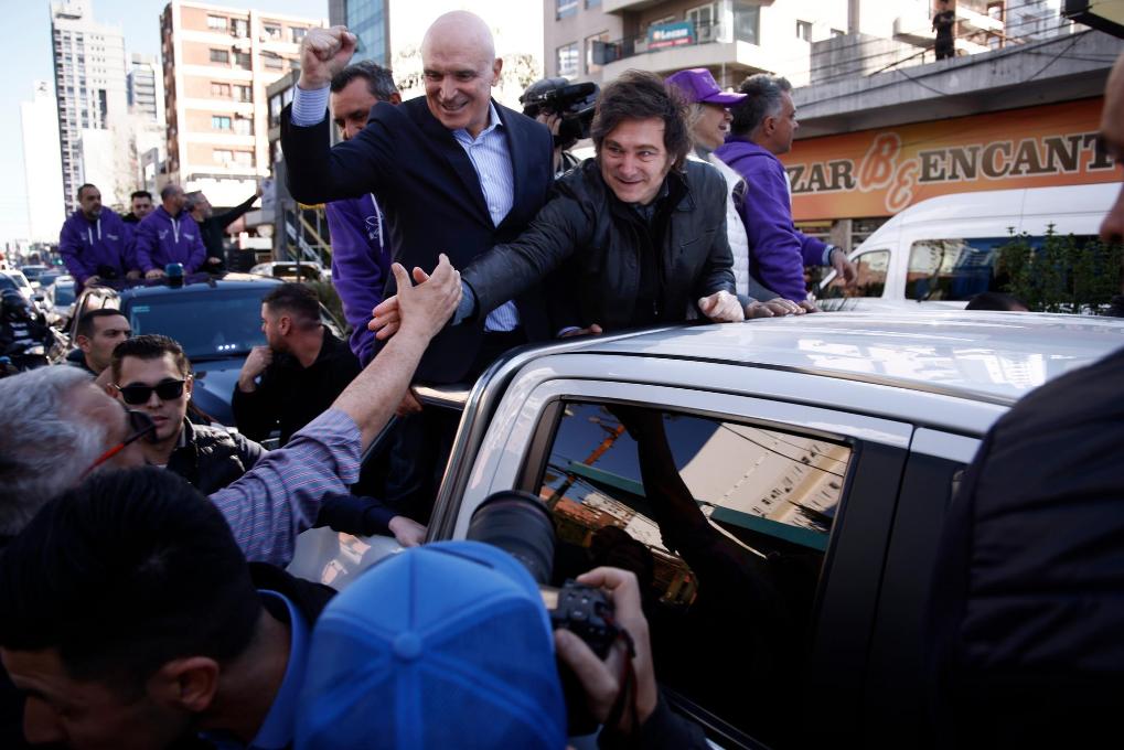 ??8月27日,在阿根廷洛馬斯德薩莫拉市,阿根廷總統(tǒng)米萊(前右一)參加助選活動(dòng)。新華社發(fā)
