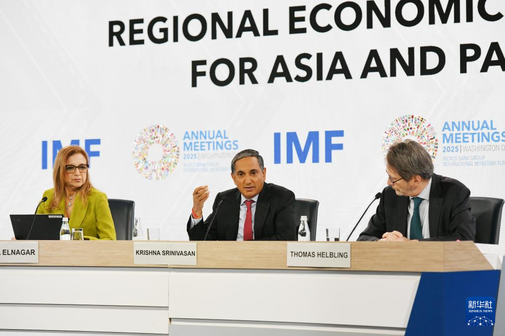 ??10月16日,在美國(guó)華盛頓,國(guó)際貨幣基金組織(IMF)亞太部主任斯里尼瓦桑(中)在新聞發(fā)布會(huì)上講話。新華社記者 李睿 攝