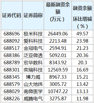 14只科創(chuàng)板股融資余額增幅超10%