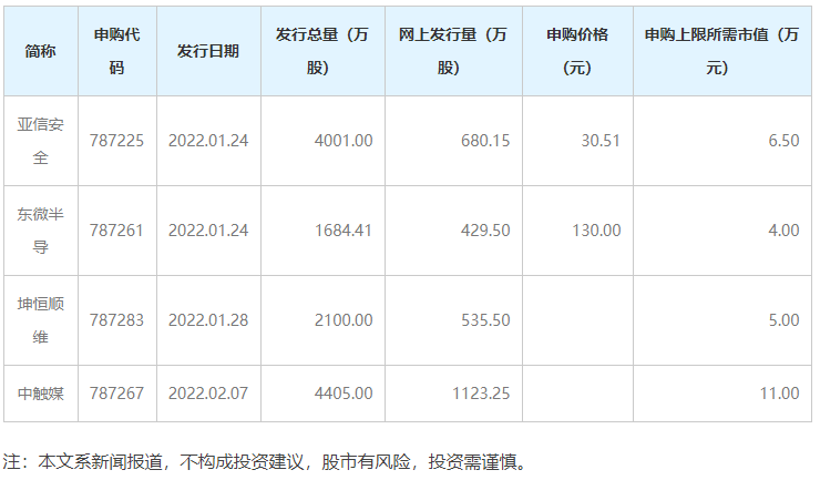 根據(jù)發(fā)行安排,4只科創(chuàng)板新股即將發(fā)行。1月24日發(fā)行的是亞信安全、東微半導(dǎo);1月28日發(fā)行的是坤恒順維;2月7日發(fā)行的是中觸媒。即將發(fā)行的這4只新股合計(jì)預(yù)計(jì)募資46.23億元。