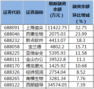 上海誼眾等7只科創(chuàng)板股融資余額增幅超10%