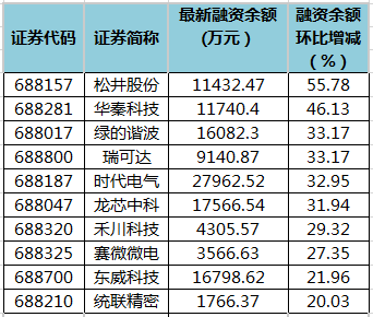 松井股份等10只科創(chuàng)板股融資余額增幅超20%