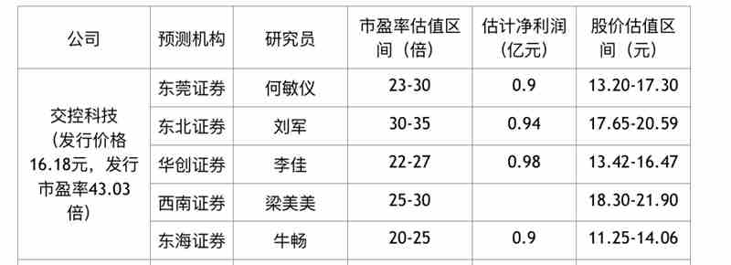 東莞證券何敏儀給予交控科技23倍-30倍的市盈率估值,股價區(qū)間落在13.20元-17.30元;華創(chuàng)證券李佳給予其22倍-27倍的估值,股價區(qū)間落在13.42元-16.47元。