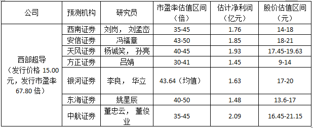 中證網訊(記者 羅晗)7月22日,西部超導將在科創(chuàng)板上市。此前,已有多家券商發(fā)布對其的估值。據西南證券劉崗等估計,西部超導2019年股價區(qū)間位于14-18(元),市盈率區(qū)間位于35-45(倍)。
