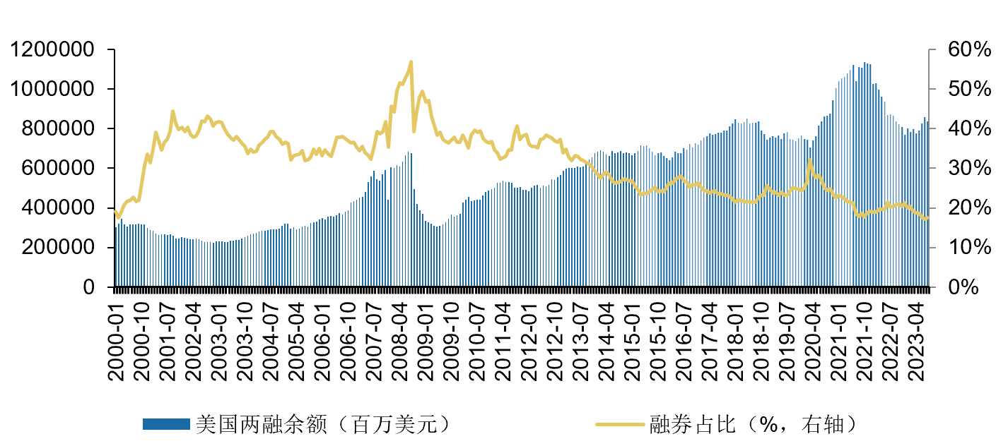 陳福表示,融券業(yè)務(wù)占比在我國兩融業(yè)務(wù)結(jié)構(gòu)中長期偏低,即便科創(chuàng)板試點并逐漸推廣“約定申報融券交易機(jī)制”以來,融券占比雖有提升,但仍不足10%。截至2023年8月末,我國兩融余額15712億元,其中融券占比僅6%,而美國融資融券余額8351.74億美元,其中融券占比高達(dá)17%,占比高位時期能達(dá)到40%-50%!耙虼,相比海外成熟市場,我國融券業(yè)務(wù)仍有較大發(fā)展空間。”