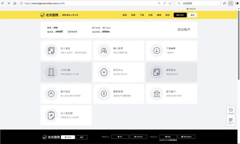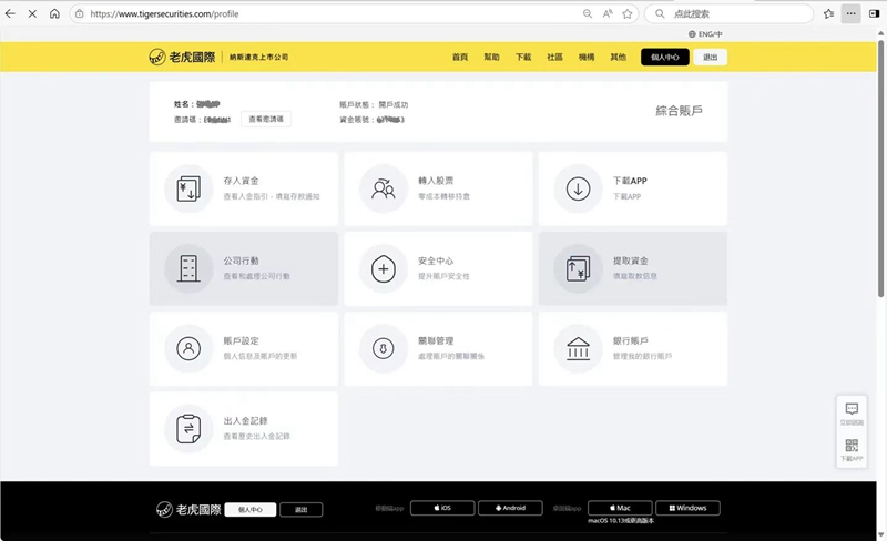 在3個工作日后,記者再次收到了老虎證券“開戶成功”的郵件通知。在記者登錄老虎證券賬戶系統(tǒng)后,系統(tǒng)顯示賬戶狀態(tài)為“開戶成功”,資金賬號為“6*****6”。賬戶的具體功能模塊包括存入資金、轉(zhuǎn)入股票、下載App和提取資金等等。
