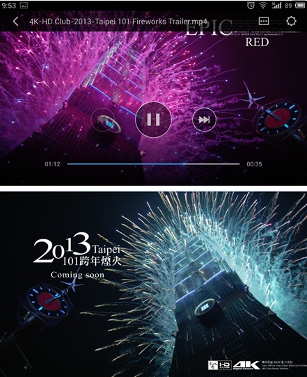 測試的樣片包括經(jīng)典的“烤鴨”和“臺北101跨年煙火”,從截圖中可以看到這兩個(gè)視頻分辨率為3840*2160(后者碼率甚至高達(dá)90mbps)。兩部短片均可流暢播放,拖動(dòng)進(jìn)度后可快速跟進(jìn)新的播放進(jìn)度,并無卡頓。同樣,后續(xù)測試的4096*2304分辨率的短片,亦可流暢播放。
