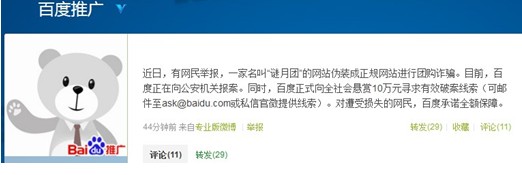 9月12日消息,記者從百度官方微博了解到,近日,有網(wǎng)民舉報,一家名叫“謎月團”的網(wǎng)站偽裝成正規(guī)網(wǎng)站進行團購詐騙。目前,百度正在向公安機關(guān)報案。同時,百度正式向全社會最高懸賞10萬元尋求有效破案線索。對遭受損失的網(wǎng)民,百度承諾依據(jù)今年早些時候推出的“網(wǎng)民權(quán)益保障計劃”進行全額保障!