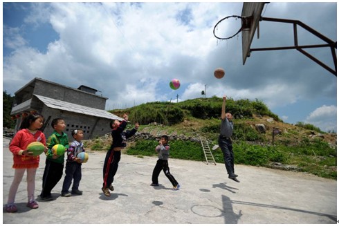 。ㄍ跤雷@蠋煄ьI(lǐng)孩子們?cè)跊](méi)有院墻的操場(chǎng)打籃球)