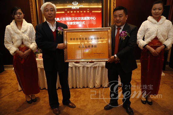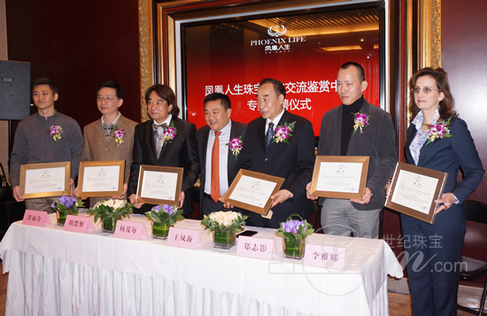 在此次珠寶預(yù)展活動(dòng)現(xiàn)場(chǎng),舉行了鳳凰人生珠寶文化交流鑒賞中心專家受聘儀式,鳳凰人生公司負(fù)責(zé)人給王春生、王鳳海、胡楚雁、洪福壽、摩汰、李玉濤等專家頒發(fā)了該中心首批特聘顧問(wèn)的聘書。同時(shí),王春生主任還給該中心頒發(fā)了國(guó)家首飾質(zhì)量監(jiān)督檢驗(yàn)中心指定授權(quán)機(jī)構(gòu)的牌匾。