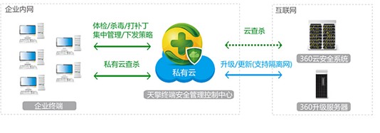 360企業(yè)版安全軟件由服務(wù)器端和客戶端2個(gè)組成部分。首先,在各級(jí)單位的服務(wù)器上部署360企業(yè)版服務(wù)器端,保證網(wǎng)內(nèi)所有的客戶端能聯(lián)網(wǎng)訪問到,然后,在直屬管理的終端設(shè)備上部署360企業(yè)版客戶端。