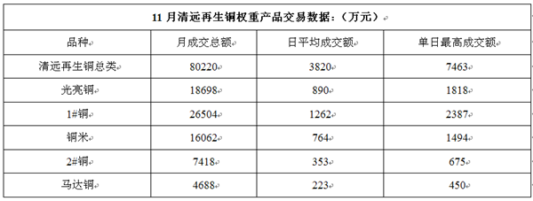 在銅米交易上,有賴于下游電子廠年末備料的刺激作用,本月交易量反而增加8362萬元,增幅達(dá)108.5%。而占中低品位比重較大的2#銅與馬達(dá)銅在11月份成交額合計(jì)僅為12106萬元,占總體成交的15%。
