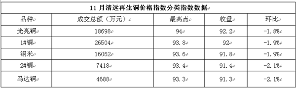 據(jù)清遠(yuǎn)銅交易中心(http://www.q-ce.com)清遠(yuǎn)再生銅價(jià)格指數(shù)平臺數(shù)據(jù)監(jiān)測,11月份21個交易日中清遠(yuǎn)地區(qū)廢銅價(jià)量齊跌,價(jià)格重心繼續(xù)下移。構(gòu)成指數(shù)代表商品總交易額80220萬元,較10月份減少7448萬元或8.5%。清遠(yuǎn)再生銅價(jià)格指數(shù)報(bào)收91.7點(diǎn),環(huán)比下跌1.9點(diǎn),跌幅為2.0%與滬銅跌幅相當(dāng)。