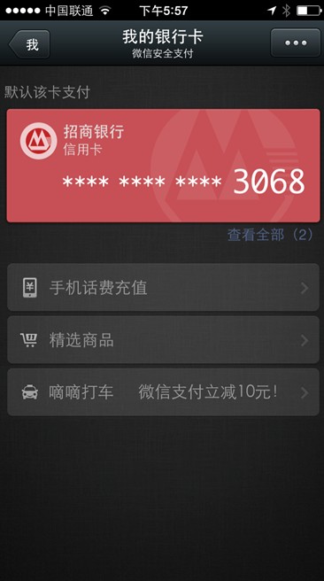 自從4月份坊間傳言騰訊砸2500萬美金投資嘀嘀打車后,嘀嘀打車與微信的合作就一直若隱若現(xiàn),成為不斷被外界猜測的話題,但嘀嘀打車和微信的合作一直猶抱琵琶半遮面。直到2013年8月,微信5.0上線發(fā)布微信支付,完成體系內(nèi)的閉環(huán),并低調(diào)在"我的銀行卡"中開始電商、話費充值等各種服務嘗試。