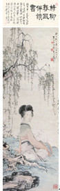 近現(xiàn)代名家的傳統(tǒng)仕女題材歷來(lái)為收藏者所喜愛(ài),張大千的仕女畫尤受追捧,張大千的人物畫獨(dú)出機(jī)杼、清麗雍雅,成就極高。有學(xué)者評(píng)價(jià)“張大千在人物畫上的功力與造詣,的確是宋元以來(lái)少見(jiàn),不論仇英、陳洪綬等,也都難以籠罩張大千的廣博德樣性!敝嫾矣诜情溡苍f(shuō):“大千人物,尤以仕女最為畫道人贊賞,謂能大膽別創(chuàng)新意。”原因是“他對(duì)于女性觀察得很精密,能用妙女拈花的筆法,曲曲傳出女兒的心聲,這一點(diǎn)是他的藝術(shù)微妙,也是他在女性上曾下了一番工夫的收獲!贝笄壬苍谝皇最}畫詩(shī)中自道:“眼中恨少奇男子,腕底偏多美婦人!贝朔伺菑埓笄г缒甑淖髌,題款中說(shuō)明擬石濤筆法,大千最早學(xué)習(xí)仕女畫是師法明清眾家,臨習(xí)古代畫稿入手,任伯年、石濤、禹之鼎、改琦、費(fèi)丹旭、華嵒、吳小仙、唐寅等明清諸家都曾是他學(xué)習(xí)的對(duì)象,他在造型上注意身段的纖細(xì)俊秀、弱不禁風(fēng),有纖弱清秀之風(fēng)韻,此幅畫面布局嚴(yán)整,色彩柔和,生動(dòng)雅致。