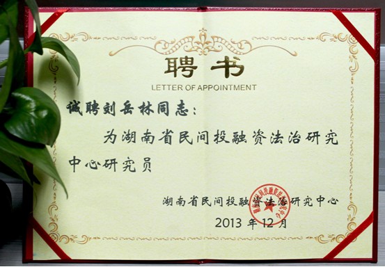 湖南省民間投融資法治研究中心聘請(qǐng)劉岳林董事長擔(dān)任研究
