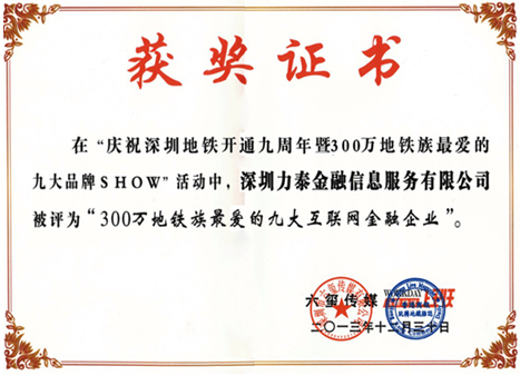 2013年12月30日,由深圳報(bào)業(yè)集團(tuán)、上海文化廣播影視集團(tuán)、深圳地鐵《上班》雜志主辦的“慶祝深圳地鐵開通九周年暨300萬地鐵族最愛的九大品牌SHOW”頒獎典禮在深圳隆重舉行。e生財(cái)富作為知名互聯(lián)網(wǎng)金融企業(yè),經(jīng)專家評審層層篩選,最終突出重圍,一舉榮膺“300萬地鐵族最愛的九大互聯(lián)網(wǎng)金融企業(yè)”稱譽(yù)。