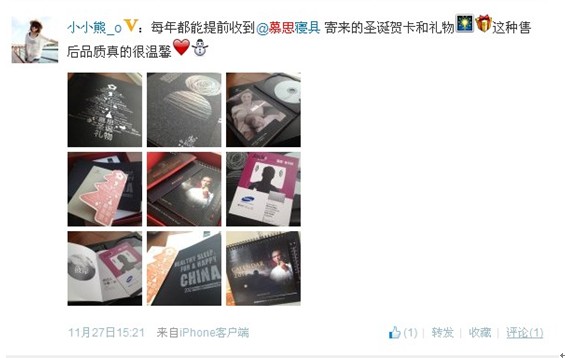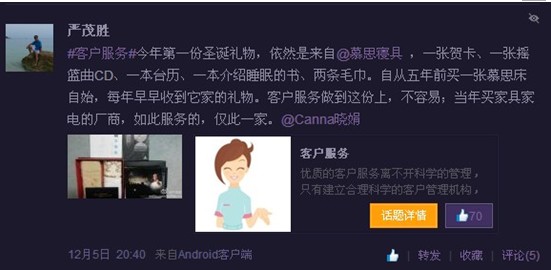 來自北京的一個名為嚴茂勝的普通用戶發(fā)微博感嘆:“今年第一份圣誕禮物,依然來自慕思寢具。自從五年前買了一張慕思床后,每年早早收到它家的禮物,客戶服務(wù)做到這份上,不容易;當年買家具家電的廠商,如此服務(wù)的,盡此一家!