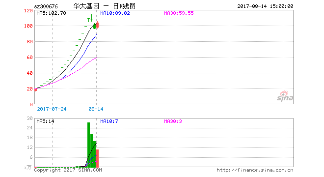 8月11日,華大基因開盤便大幅低開,收盤報95.77元/股,跌幅9.99%。這是華大基因連續(xù)兩個交易日以跌勢收盤。7月14日登陸創(chuàng)業(yè)板的華大基因,上市后創(chuàng)下連續(xù)19個漲停,股價也由16.37元/股,最高漲至114.88元/股,市值最高時接近460億元。
