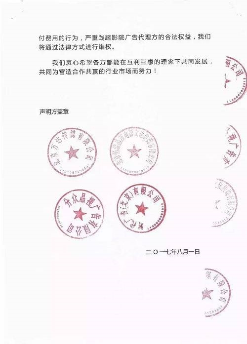 影院廣告方聯(lián)名投訴《戰(zhàn)狼2》8月9日,由北京萬達傳媒有限公司、分眾晶視廣告有限公司、北京暢游晶茂電影文化傳媒有限公司、時代廣告(北京)有限公司四家蓋章聯(lián)名發(fā)出的聲明函(落款日期為8月1日)稱,《戰(zhàn)狼2》在影片母盤中強行搭載5條預(yù)告片而不支付費用,嚴重踐踏影院廣告代理方的合法權(quán)益。