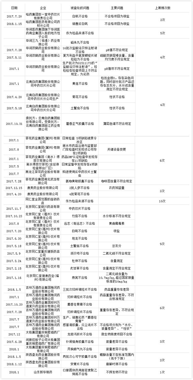 據(jù)中國(guó)網(wǎng)財(cái)經(jīng)記者不完全統(tǒng)計(jì),僅去年一年,因各種質(zhì)量問題,同仁堂旗下企業(yè)10次被曝光,其中,北京同仁堂(亳州)飲片有限責(zé)任公司上“黑榜”次數(shù)高達(dá)7次。