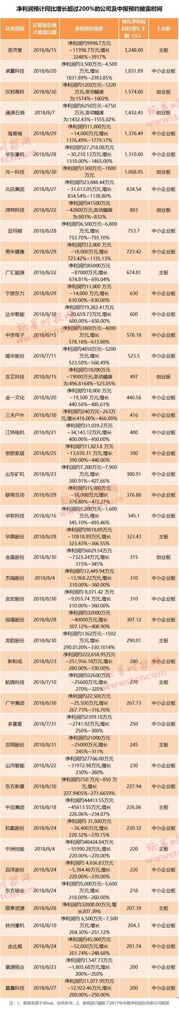 圣濟(jì)堂、卓翼科技、漢邦高科、通源石油、海普瑞、華東重機(jī)、光一科技預(yù)計(jì)今年中期凈利潤(rùn)同比增長(zhǎng)1000%以上。
