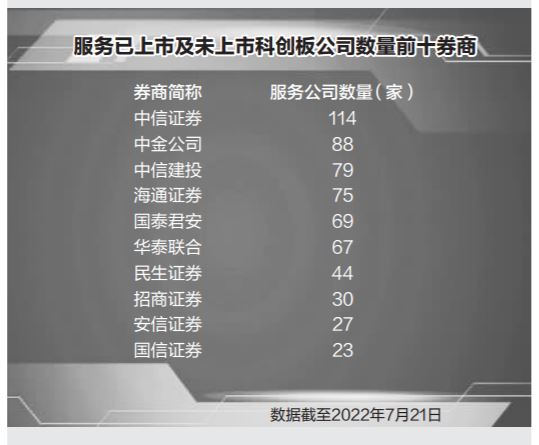 Wind數(shù)據(jù)顯示,科創(chuàng)板主承銷商中,中信證券、中金公司、中信建投證券三家“中”字頭券商占據(jù)行業(yè)前三位,服務(wù)的已上市及未上市公司數(shù)量均超過70家;海通證券、國泰君安證券、招商證券等頭部券商服務(wù)的已上市及未上市科創(chuàng)板公司數(shù)量均超過30家,位居行業(yè)前列。