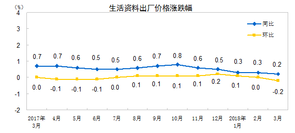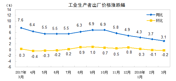 2018年3月份,全國工業(yè)生產(chǎn)者出廠價格同比上漲3.1%,環(huán)比下降0.2%。工業(yè)生產(chǎn)者購進價格同比上漲3.7%,環(huán)比下降0.3%。一季度,工業(yè)生產(chǎn)者出廠價格同比上漲3.7%,工業(yè)生產(chǎn)者購進價格同比上漲4.4%。