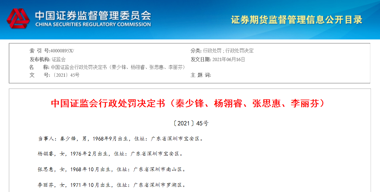 證監(jiān)會(huì)日前發(fā)布的一則行政處罰決定書顯示,證監(jiān)會(huì)對(duì)秦少鋒等人內(nèi)幕交易珠海市樂通化工股份有限公司(以下簡(jiǎn)稱樂通股份)股票行為進(jìn)行了立案調(diào)查、審理,證監(jiān)會(huì)決定:對(duì)當(dāng)事人秦少鋒、張思惠處以60萬元罰款,對(duì)當(dāng)事人楊翎睿、李麗芬處以60萬元罰款。