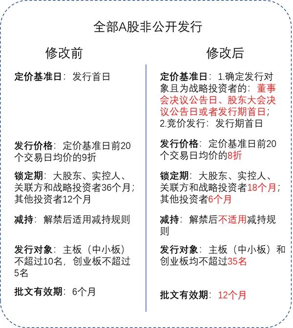 中證網(wǎng)訊(記者 胡雨)據(jù)中證協(xié)投資者之家2月21日消息,為深化金融供給側(cè)結(jié)構(gòu)性改革,進(jìn)一步提高直接融資比重,增強(qiáng)金融服務(wù)實(shí)體經(jīng)濟(jì)的能力,提高上市公司質(zhì)量,2020年2月14日證監(jiān)會(huì)發(fā)布了《關(guān)于修改〈上市公司非公開(kāi)發(fā)行股票實(shí)施細(xì)則〉的決定》,對(duì)《上市公司證券發(fā)行管理辦法》、《創(chuàng)業(yè)板上市公司證券發(fā)行管理暫行辦法》以及《上市公司非公開(kāi)發(fā)行股票實(shí)施細(xì)則》(以下統(tǒng)稱“再融資新規(guī)”)部分條款進(jìn)行了修改,放寬了對(duì)主板(中小板)、創(chuàng)業(yè)板上市公司定向增發(fā)股票的監(jiān)管要求。