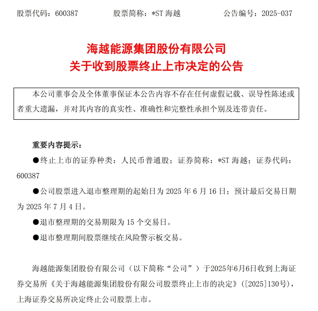 6月6日晚,*ST海越發(fā)布公告稱,公司6月6日收到上海證券交易所《關(guān)于海越能源集團股份有限公司股票終止上市的決定》。同日,公司收到證監(jiān)會下發(fā)的《立案告知書》,因涉嫌信息披露違法違規(guī),公司被立案。