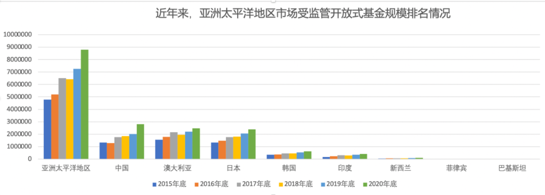 2015年至2018年,中國開放式公募基金規(guī)模亞太排名在第二、第三徘徊。2019年,開放式公募基金規(guī)模排在澳大利亞和日本之后,位列亞太地區(qū)第三。