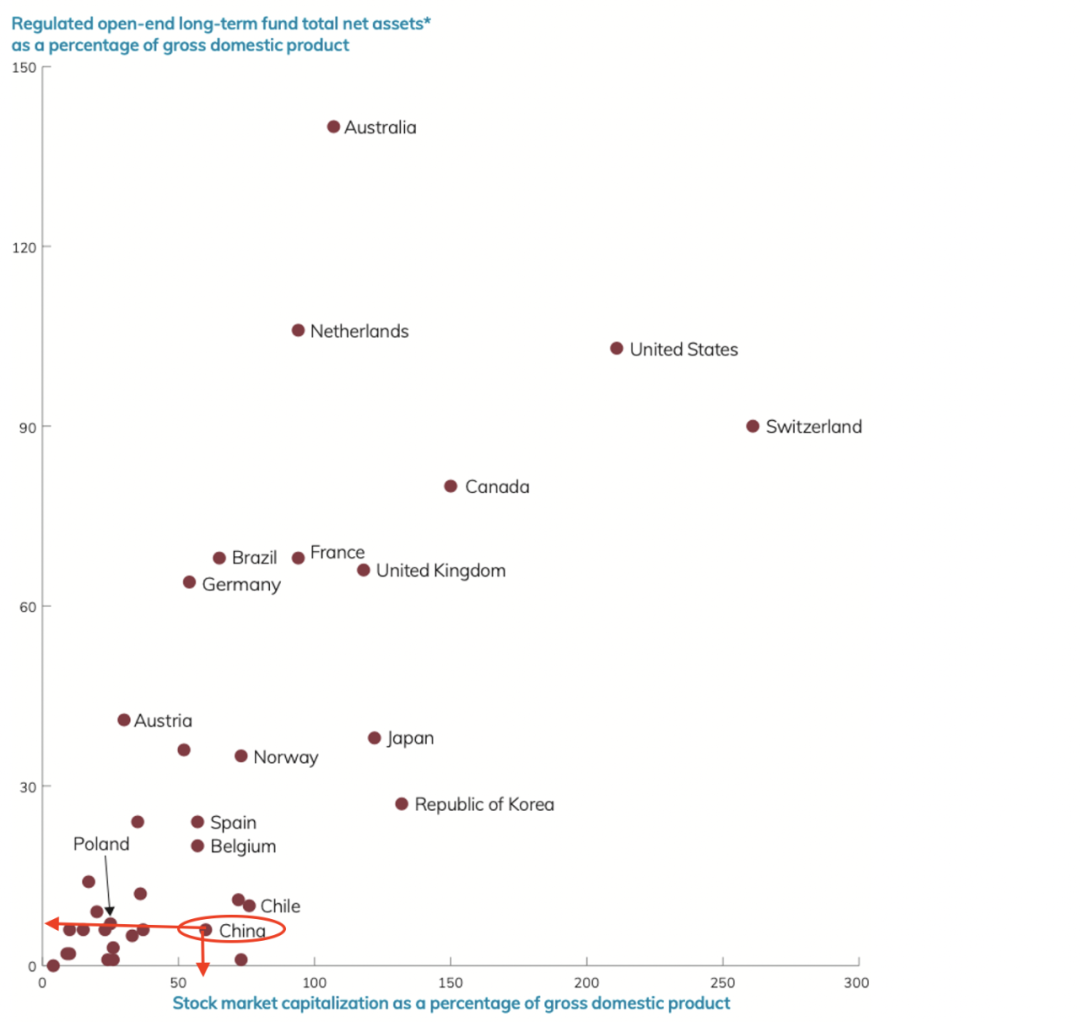 美國長期限基金規(guī)模占GDP比例大于90%,股市市值占GDP比例超過200%。加拿大長期限基金規(guī)模占GDP比例大于60%,股市市值占GDP比例超過150%。相比之下,中國股市市值占GDP比例和長期限基金規(guī)模占GDP比例都有巨大的提升空間。