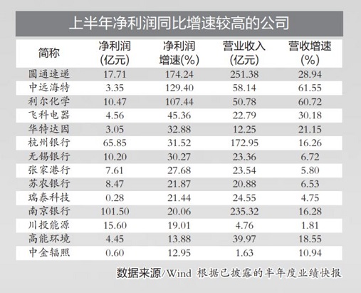 Wind數(shù)據(jù)顯示,截至7月13日記者發(fā)稿時(shí),已有22家上市公司披露了半年度業(yè)績快報(bào),其中17家公司上半年凈利潤同比增長。截至目前,上半年凈利潤同比增幅最大的是圓通速遞,實(shí)現(xiàn)凈利潤17.71億元,同比增長174.24%;中遠(yuǎn)海特、利爾化學(xué)上半年凈利潤增幅也超過100%,分別達(dá)到129.40%、107.44%。