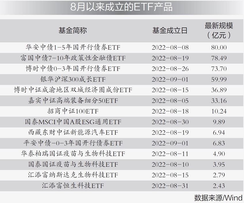 Wind數(shù)據(jù)顯示,今年8月以來,共成立了14只ETF產(chǎn)品,其中包括2只QDII基金、4只債券型基金、8只股票型基金。