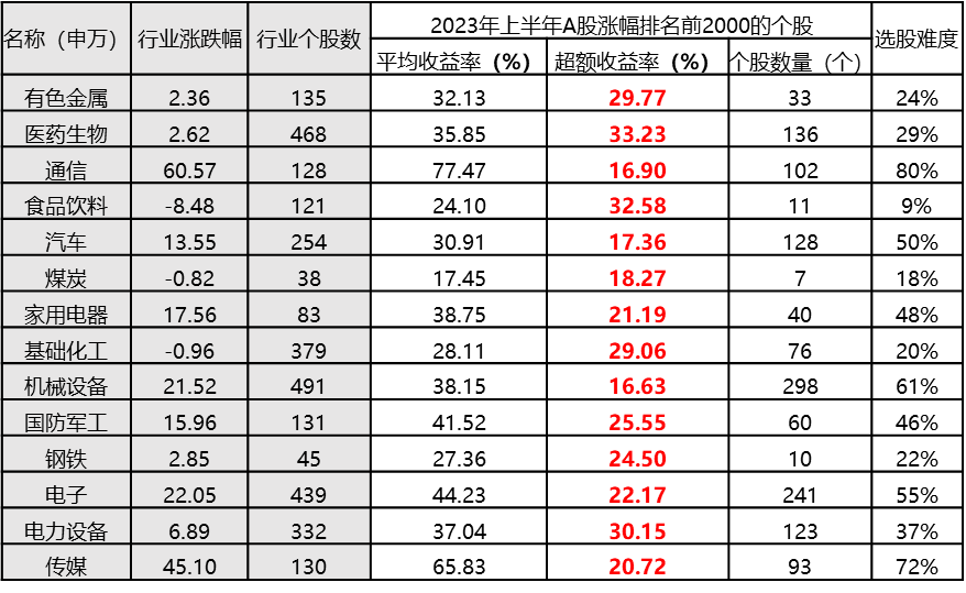 數(shù)據(jù)來源:wind,富榮基金,統(tǒng)計(jì)時(shí)間2023年1月1日-2023年6月30日。超額收益率計(jì)算方法:選出2023年上半年A股漲幅前2000的個(gè)股,按照申萬一級(jí)行業(yè)分類后,計(jì)算其中對(duì)應(yīng)各行業(yè)的平均漲幅,減掉行業(yè)指數(shù)的漲幅,為超額收益率。表格內(nèi)容僅用于說明個(gè)股與行業(yè)整體的市場表現(xiàn)存在差異,不構(gòu)成任何投資推薦。市場過往表現(xiàn)不預(yù)示未來,市場有風(fēng)險(xiǎn),投資需謹(jǐn)慎。