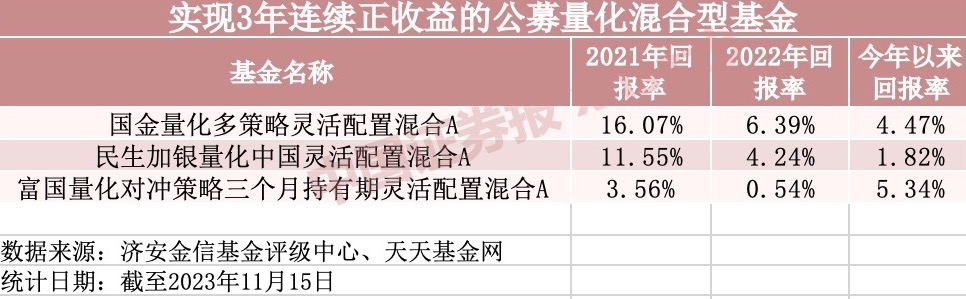更有3只公募量化混合型基金,實(shí)現(xiàn)連續(xù)三年以上的正收益,分別是國金量化多策略靈活配置混合A、民生加銀量化中國靈活配置混合A、富國量化對(duì)沖策略三個(gè)月持有期靈活配置混合A。