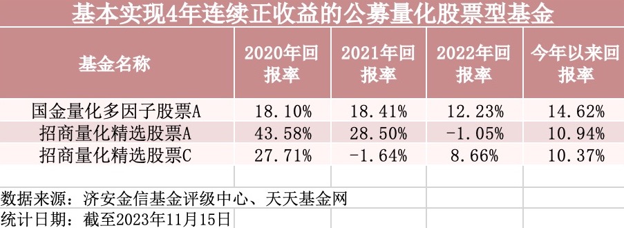 上述3只產(chǎn)品,也基本實(shí)現(xiàn)了近四年連續(xù)正收益。具體看來,國金量化多因子股票A自2020年以來的業(yè)績(jī)每年均超過12%,更在今年實(shí)現(xiàn)了超14%的高收益。招商量化精選股票A和招商量化精選股票C僅在2022年略虧,在其余年份均實(shí)現(xiàn)了正收益。
