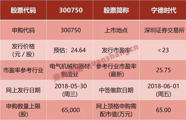 具體來(lái)看,寧德時(shí)代申購(gòu)代碼為300750,申購(gòu)日期為5月30日(周三),中簽繳款日為6月1日(周五),頂格申購(gòu)需要深市市值65萬(wàn)元。對(duì)于網(wǎng)下配售的投資者,需配市值6000萬(wàn)元。