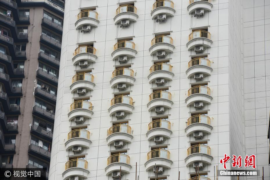 2017年8月13日,重慶市渝中區(qū)洪崖洞旁一酒店,所有客房陽臺統(tǒng)一安裝空調(diào)后,遠看外墻如有百雙“眼睛”。 圖片來源:視覺中國