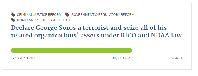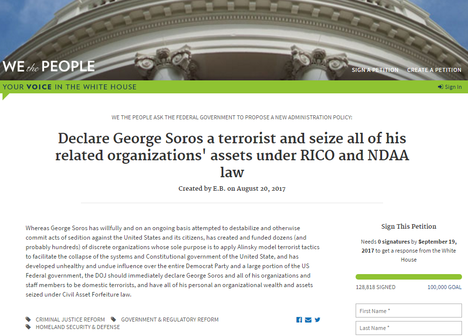 一位注冊(cè)名為E.B.的用戶8月20日在白宮請(qǐng)?jiān)妇W(wǎng)上發(fā)布了請(qǐng)?jiān)笗,要求美國政府按照反詐騙腐敗組織集團(tuán)犯罪法(RICO)和國防授權(quán)法案(NDAA)宣布索羅斯為恐怖分子并沒收與他相關(guān)組織的財(cái)產(chǎn)。