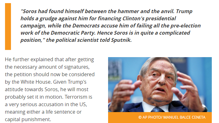 請(qǐng)?jiān)竷?nèi)容稱,索羅斯“不斷蓄意破壞美國穩(wěn)定,并實(shí)施了其他煽動(dòng)對(duì)抗美國及其公民的犯罪行為”,他創(chuàng)建并資助了數(shù)十個(gè)(甚至數(shù)百個(gè))游離的組織,唯一目的是利用阿林斯基式恐怖主義策略來摧毀美國。這已經(jīng)在民主黨和美國政府內(nèi)部產(chǎn)生了不良、不當(dāng)?shù)挠绊。?qǐng)?jiān)笗蟆懊绹?lián)邦政府和司法部應(yīng)盡快宣布索羅斯、其所屬的公司及其成員為恐怖分子”,“并根據(jù)美國民事沒收制度,剝奪其全部財(cái)產(chǎn)和資產(chǎn)”。請(qǐng)?jiān)钢刑岬降陌⒘炙够髁x來自于1990年代中期美國社會(huì)運(yùn)動(dòng)家索爾·阿林斯基,“阿林斯基”是美國左翼激進(jìn)主義的代名詞。