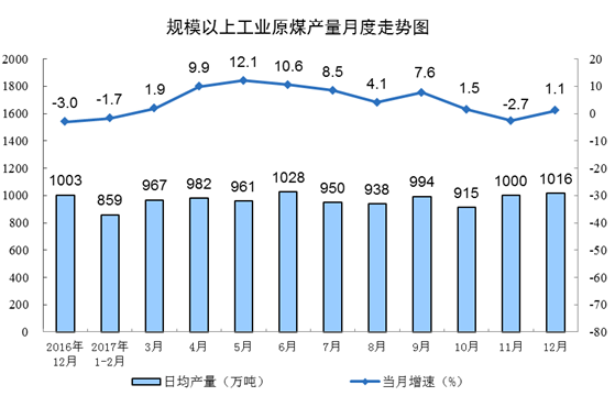 12月份,原煤產(chǎn)量3.1億噸,同比增長(zhǎng)1.1%,增速由負(fù)轉(zhuǎn)正;日均產(chǎn)量1015.7萬噸,比11月份增加15.8萬噸。1-12月份,原煤產(chǎn)量34.5億噸,同比增長(zhǎng)3.2%。