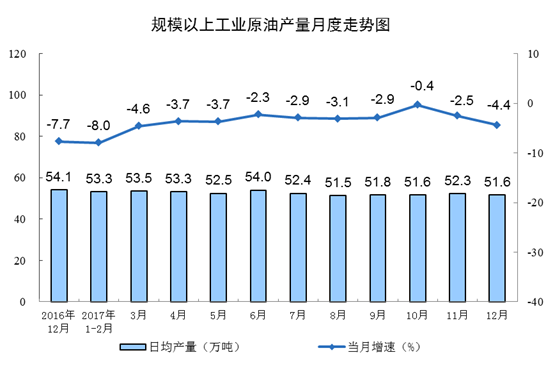 受油田后備資源接替不足、計(jì)劃性減產(chǎn)及寒潮天氣等因素影響,原油生產(chǎn)持續(xù)下降。12月份,原油產(chǎn)量1598.4萬噸,同比下降4.4%,降幅比11月份擴(kuò)大1.9個(gè)百分點(diǎn);日均產(chǎn)量51.6萬噸,比11月份減少0.8萬噸。1-12月份,原油產(chǎn)量1.9億噸,同比下降4.0%。