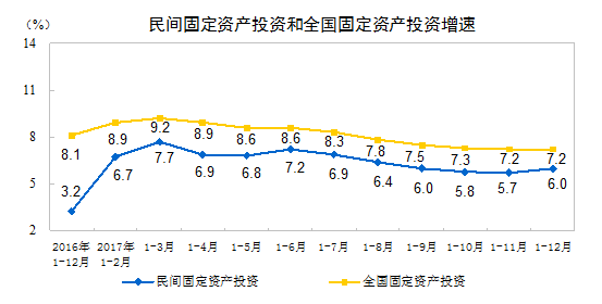 2017年,民間固定資產投資381510億元,比上年名義增長6.0%,增速比1-11月份提高0.3個百分點。民間固定資產投資占全國固定資產投資(不含農戶)的比重為60.4%,比1-11月份回落0.1個百分點。