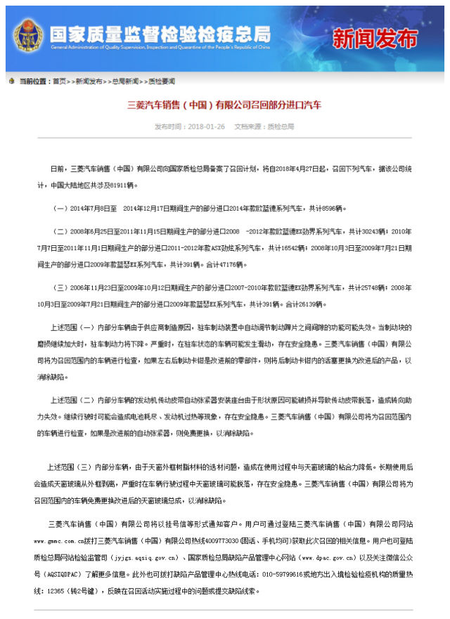 日前,三菱汽車銷售(中國)有限公司向國家質(zhì)檢總局備案了召回計劃,將自2018年4月27日起,召回下列汽車,據(jù)該公司統(tǒng)計,中國大陸地區(qū)共涉及81911輛。